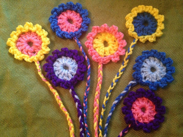 This is a quick, free stashbuster project for using up snippets of yarn or churning out party favors. It will work in any size of yarn from fingering through aran; use an appropriately-sized hook for the project.