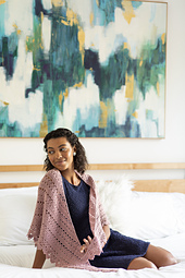 The Bridesmaid Shawl is worked top down from the back of the neck, with increasing done at the sides and the center spine. A simple 6-row repeat can be done a variable number of times to create different sizes. The net and picot-scalloped lower edging set off the lacework making this an elegant, heirloom shawl to treasure.