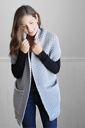Crochet this beautifully textured cardigan using the popular waffle stitch! The Watson Waffle Crochet Cardigan is a chunky sweater that looks so cozy with its long length, bulky feel, and large pockets. This cardigan works up very quickly, is easy to construct, and will look beautiful layered over jeans, leggings, or your favourite lounge wear! You can crochet 16 different sizes from baby to 5XL.