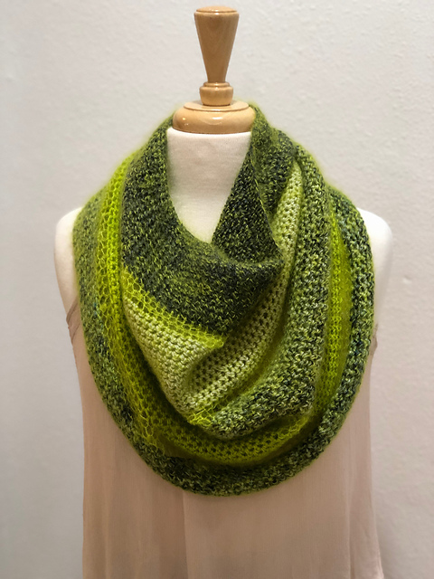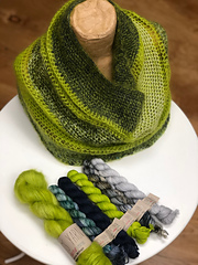 Stands of mohair and silk are held together in places with mini skeins of sock yarn to created a drapes cowl with a beautiful halo and pops of gorgeous color. Perfect for gift giving or treating yourself, we bet you can’t make just one.