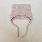 The bonnet is worked back and forth: you begin at the band, which you can make either in moss stitch or ribbed, and continue in stockinette stitch to the bear ears. The bear ears are shaped at the same time as you work to the crown. You then place the bear ear stitches on hold, and shape the back of the bonnet to the neck, by working short rows and decreases. The bonnet has an I-cord edge and I-cord strings to tie it up.