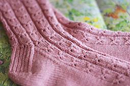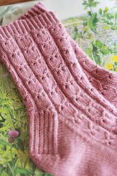 Socks are knit from the cuff down, a lacy and simple cable texture. The pattern is easy to memorize and charted only. The pattern uses the magic loop method but it is easily adaptable to your favorite method. Traditional heel flap and wedge toe are used as well. The pattern is written for one size, it is adjustable by simply changing your needle size. Adding or decreasing purl stitches between lace stitches is an option if you need to go up or down in actual stitch count. I used a solid color in one of my favorite sock yarns, the texture really stands out.