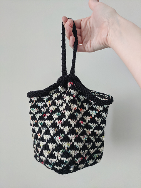 A simple yet engaging pattern I came up with for a wrist project bag. You could do away with the chart and just do it all in one color (maybe that special skein of handpainted you've been saving?) or come up with your own repeat design!