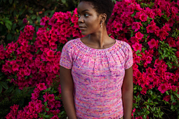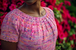 **Yarn Description:** Our samples were knit using Hello Stella Fibres Basic Stella Sock, a squishy 2-ply 80% Superwash Merino 20% nylon blend fingering weight yarn featuring a firm twist for excellent stitch definition and a soft hand for a light drape that's perfect for garments. Saturated, variegated color lends a vibrant summer feel to this charming short sleeve tee.