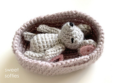 The Baby Mouse in Basket pattern includes instructions for a little, newborn mouse, his Moses basket bed, and a leaf blanket. This sweet amigurumi set is a fun pretend play toy for young children to practice bedtime routines. The baby mouse fits perfectly inside of the basket, nesting under his leaf blanket, and kids will enjoy putting the young animal to sleep. It is relatively quick to work up given its size and makes a wonderful gift for girls and boys like.
