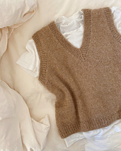 The brown Stockholm Slipover V-neck is knitted in Sunday by Sandnes Garn in the color Camel \[2542\] held together with Tynn Silk Mohair by Sandnes Garn in color Lys beige \[3021\].