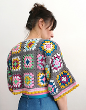 Colourful granny squares combine to make a fun and funky cropped jacket, with three-quarter length sleeves. It’s the perfect stash-buster, which can be adapted to any DK (8-ply) yarn in any colour combination.