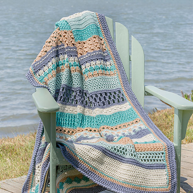 Also available as a [**monthly subscription**][1] packed with everything you need to crochet a beautiful Seaside Sampler afghan. Perfectly paced, this 11 month kit series is guided by expert online video tutorials and helpful instructions. Your first kit includes the yarn and patterns for your first 3 stripes plus 4 useful gifts. Each month you'll create 3 more stripes – 30 in all!