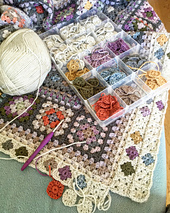 It uses 18 balls of Stylecraft Special DK, 2 of Deramores Studio DK, 2 of Scheepjes Colour Crafter and 6 balls of Stylecraft Batik.