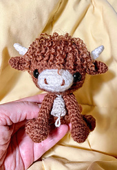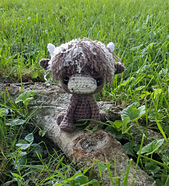 Hilde The Cow is crocheted in worsted weight yarn and is approximately 5 inches tall.