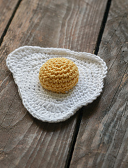 This pattern is for a life-size crochet fried egg, that can be used as a pin cushion or toy in kid's playroom. It is made of two parts, that are sewn together, and it takes about 1.5 hours to complete.