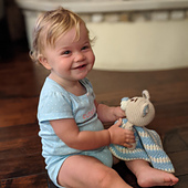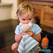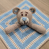 This lovey is made with size G crochet hook using Bernat softee baby cotton yarn. The bear has a cute, happy face, and the squeezable arms are the perfect size for little hands to grasp. The colorful blanket is constructed using a simple moss stitch.