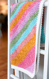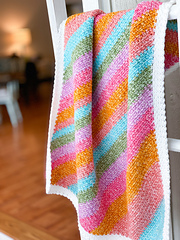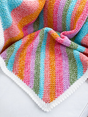 This corner to corner moss stitch blanket features diagonal stripes and a wide border with a tiny bobble edging.