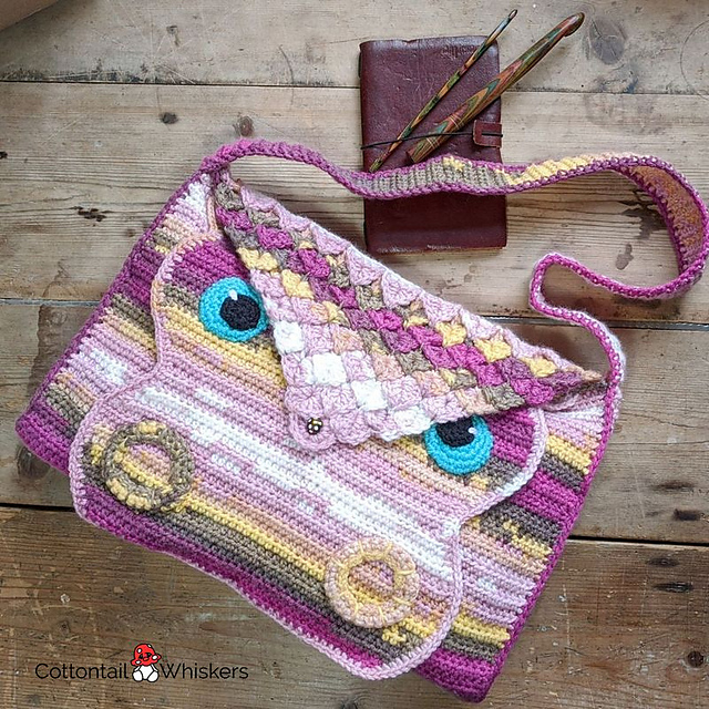 Our Wide Crochet Dragon Scale bag. Crochet this distinctive satchel bag with our detailed pattern. Instant download PDF with many pages of guide notes and photograph assistance from Cottontail & Whiskers. English with American terminology