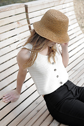 Gehäkelter 'Bucket Hat' mit breiter, nach unten geneigter Krempe. Der Hut wird von oben nach unten mit festen Maschen in Spiralrunden gehäkelt und kann sowohl aus Raffia als auch aus Baumwolle gefertigt werden.