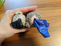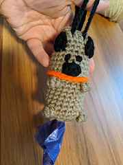 This pattern is for a dog shaped poop bag holder that can be made in a variety of colors. Fluffy yarn is best for the body. You will need a small button for the draw string at the top. This pattern was designed for standard size bag rolls, and you will need to adjust accordingly if you are using different size rolls.