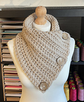 I love three button cowls! They are so versatile because they can be worn in so many different ways. This pattern works up very quickly, but I think it really makes a statement! The cowl is simply a rectangle with three buttons sewn on.