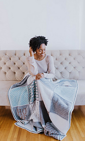// Lightweight and perfectly sized for cuddling on the couch, this holiday-themed sampler blanket will be throw you'll reach for year-round.
