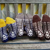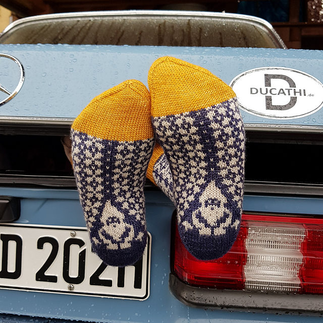 The original socks are two-coloured, but please feel free to choose another contrast colour for band, heel and tip. In this case you need about 30 g less of the main color.