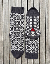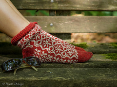 While you are knitting your way through the snow flurry on the leg, the little dwarf makes himself comfortable in his hut downside on the sole. Right after you have finished the heel he is waiting for you.