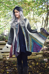 **Lots of people have asked about the specific yarn and quantities I used for the coat pictured - here's the answer!** - I used a lot of different colors of the recommended Shawl in a Ball - the main body is Feng Shui Gray, and the Medium size uses 2.5 skeins of that for the entire body. One entire skein of that same yarn makes about 2.5 of the diamond panels (which will take the same amount of yarn no matter the size), and I mixed and matched the colors a lot for those but the ones I used are Metallic Prism, Metallic Moonstone, Peaceful Earth, and Calming Desert The Hood is also mixed and matched and includes some Metallic Namaste Neutrals as well.