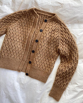 The brown Jenny Jacket is knitted In Sunday by Sandnes Garn in the color Camel [2542] held together with Tynn Silk Mohair by Sandnes Garn in color Brunt sukker [2543].