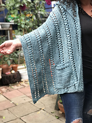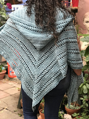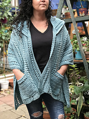 Worked top down this uniquely shaped shawl give tons of room and warmth up front, while still keeping length in the back. Pockets and Hood worked separately and attached.