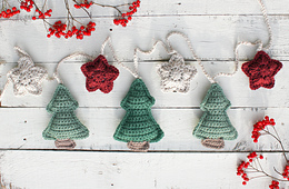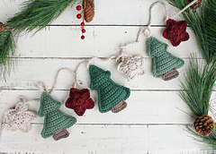 This Christmas Tree and Star Crochet Garland will have your home ready for Christmas in no time! Fast and easy to make, the 2D style pieces (two flat panels, stuffed and joined together) can be made into a garland for a festive addition to your fireplace, used as place setting decor, or strung individually to use as ornaments!
