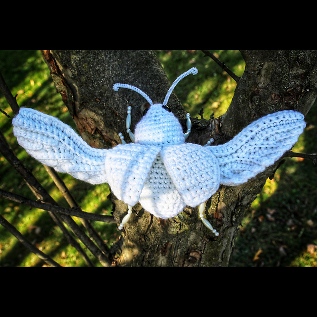 The Style 1 Beetle (Scarab) from this pattern is 2.5 inches tall from bottom of foot to top of carapace (outer wings), 4.5 inches long from head to tail, and 3 inches wide from side to side. The Style 2 Beetle (Curvier Scarab) from this pattern is 2.5 inches tall from bottom of foot to top of carapace, 5 inches long from head to tail, and 3 inches wide from side to side. The Style 3 Beetle (Stag) from this pattern is 3 inches tall from bottom of foot to top of carapace, 7.5 inches long from tip of horn to tail, and 2.5 inches wide from side to side. The Style 4 Beetle (Hercules) from this pattern is 2.5 inches tall from bottom of foot to top of carapace, 8.5 inches long from tip of upper horn to tail, and 2 inches wide from side to side. The Style 5 Beetle (Rhino) from this pattern is 3 inches tall from bottom of foot to top of carapace, 8 inches long from tip of horn to tail, and 2 inches wide from side to side. Wingspan for optional Inner Wings is 9 inches from tip to tip.