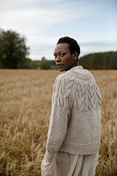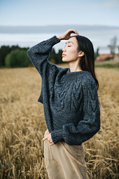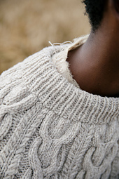 The circle yoke pullover was designed to feature a deep yoke with bold cables. The pattern comes in two different length options: cropped and regular. The sweater is shown in two different versions: one made holding a strand of each sport weight yarn and silk mohair together, the other made with one strand of worsted weight yarn.