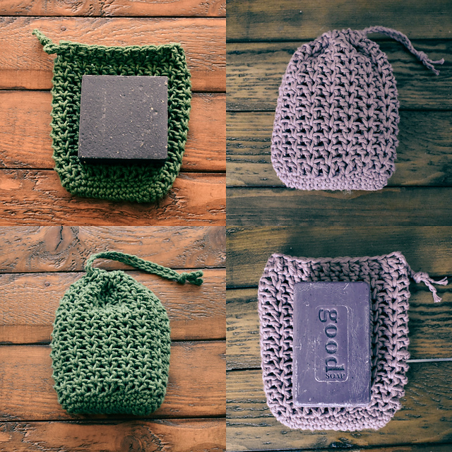 The pattern is written for a single (large) size, and instructions are provided for increasing or decreasing the width and length. Soap pictured with green bag is "Dr. Squatch" soap and measures about 3 inches by 3 inches.