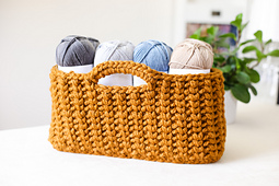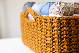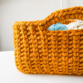 ***Get yourself organized with the practical and cozy Jessie Stash Basket.*** These large rectangular baskets are made by holding two strands of super bulky yarn together with a 9mm hook. Alternate the waistcoat stitch and single crochet in the back loop for an unexpectedly beautiful texture. Bet you can't make just one!