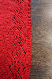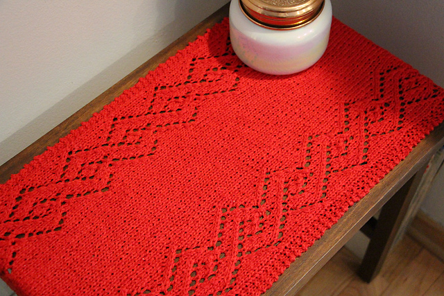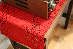 **A Note About Sizing**: This pattern is easy to size up or down depending on your table size, the amount of yarn you have, and your personal preferences. If you want to make the table runner wider or narrower, simply add or subtract stitches to your cast-on. The lace edges of the table runner are a fixed number of stitches, but adding or subtracting stitches to the cast-on will change the number of stitches in the center stockinette panel. Additionally, it is easy to make the table runner longer or shorter by adding or subtracting one or more pattern repeat. However, making any adjustments to width or length will alter the amount of yarn that you will need for the pattern.