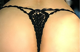 This little naughty thong is crocheted in one piece from the back - only the ribbons are attached. You need about 20 g of 3 ply mercerized cotton (50 g and 260 m).