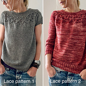 *Laia* is a sister pattern to [Eula (published March 2019)][2] and is a stockinette, buttonless version. It is worked seamlessly from the top down with a cute lace pattern around the top of the yoke. First some short rows are worked back and forth to create a higher back neck and then the yoke is worked in rounds top down to sleeve separation. Some last short rows are worked to finish the yoke shaping right before sleeve stitches are placed on hold, then the body is worked down to the ribbing. For both sleeve length options, held stitches are placed back on the needles to knit the sleeves top down to the cuffs. No additional finishing required.