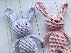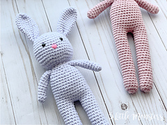 This cute little bunny is the first in a series of three long legged animals. The legs, body and head are worked in one pieces starting with the legs and working up. The ears and arms are sewn on at the end.
