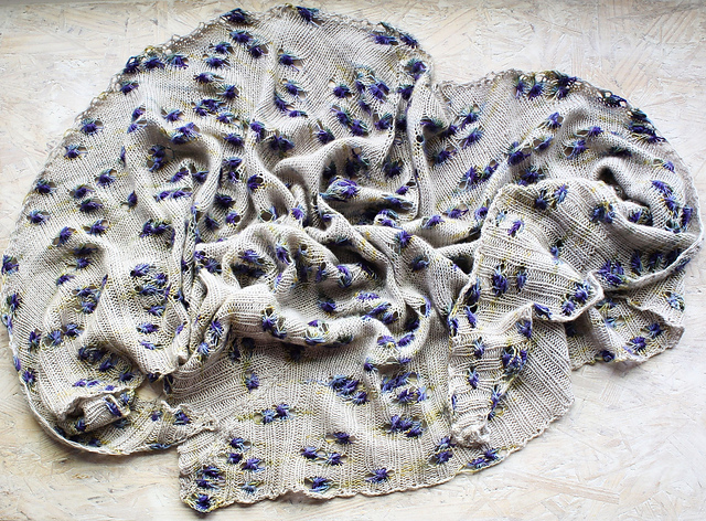 Calico is a light and airy triangle shawl reminiscent of your favorite flower print dress. I designed it to be wide enough to wrap and drape nicely while only needing two skeins of fingering weight yarn. It’s the fourth in a series of projects using the concept of Assigned Pooling. Assigned Pooling occurs when a change in stitch and texture is assigned to changes in color within a skein of variegated yarn. In this case, simple Stockinette Stitch is assigned to the main color to create a backdrop for the floret cluster stitch assigned to the accent color.