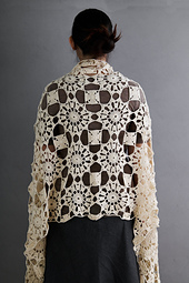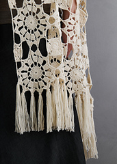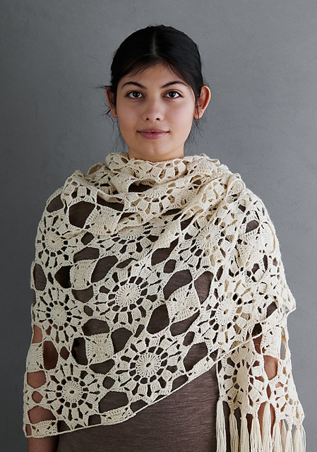 You will make this wrap with three different motifs: Mandalas, Squares, and Half Squares. You will work each motif in the round from the center out. You will work all Mandalas first, joining them as you go, until you’ve made 12 rows of 5 Mandalas each. Then you will work the Squares and Half Squares between the Mandalas. Finally, you will add fringe to each end of the wrap.