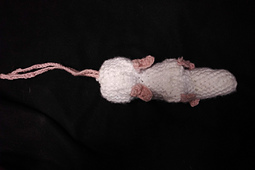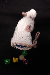 This is a pattern for a rat-shaped pouch. The tail is the drawstring, and the head is stuffed (so not actually part of the pouch). You'll need at least two colors - one for the nose/ears/legs/tail and one for the body. The finished rat is about 8 inches long from the head to the base of the tail, and it can hold around 40 polyhedral dice (that's what I use it for).