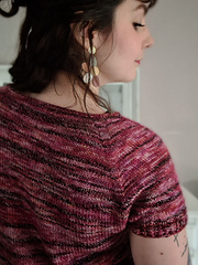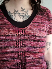 Pleione is a loose summer tee with a low V-neck and lace details. It has a simple top down raglan construction and the lace is beginner friendly.