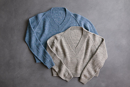 Samples: Stonewall Gray sweater shown here is size 37¼, and Mountain Bluebird one is size 41¼, worn with 5 inches of ease
