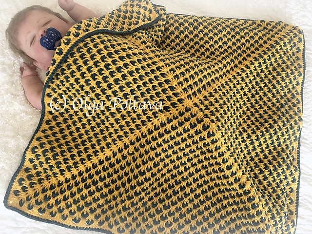 This is a pattern for a two-color granny square baby blanket, made with worsted weight (category 4, aran) yarn and size F (3.75 mm) crochet hook.