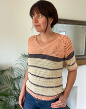 A raglan style V-neck sweater/top in half double crochet (hdc) that is suitable for confident beginners. Made with cotton and with breezy sleeves it is a great choice for summer, especially summer evenings.