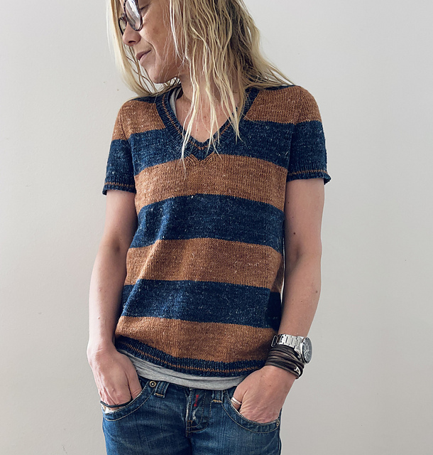 Inspired by cricket sweaters of the 90s, *Dingley Dell* is worked seamlessly from the top down using the contiguous set-in sleeve method (developed by Susie Myers) to shape the shoulders and sleeve caps. First increases are worked on both RS and WS rows to final shoulder width, then the sleeve caps are worked simultaneously with the V-neck shaping to sleeve separation. The body is then worked top down in rounds to the bottom ribbing. Short sleeves are worked top down in rounds. Neck finishing is worked last.