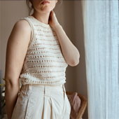 IIngrid top is worked from the top down. The back is knit first. Then, the front shoulders are picked up from the shoulder edge and worked top down as you shape the neck. Finally, front and back are joined together at the underarm and the body is knit seamlessly in the round to the hem.