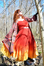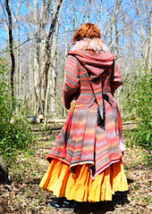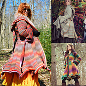 This elegant fantasy-inspired sweater coat features an A-line silhouette with a curling, pointed geometric hem shape inspired by flower blossoms, delicate pointed bell sleeves, and of course a long and ample pointed elf hood. The variegated yarn creates dazzling prisms of color across the separately worked pieces of the coat.