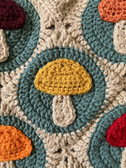 Finished, this bag is about 12 inches wide by 12 inches tall (excluding handles) when laid flat. You most definitely can choose other yarns and colors (cotton yarn might actually be a better material choice than acrylic, but acrylic was what I had on hand). You could also make all the mushrooms one color, and not have to worry so much about joining them in the right order.