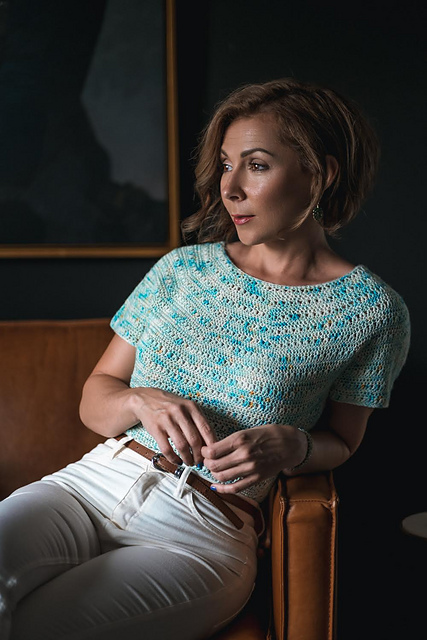 The Montastraea Tee is a beginner friendly crochet pattern. This tee is worked in a continuous round from the top down. No seaming is required! This tee is fitted with approximately 2" of positive ease. It features a fun open stitch combination and simple capped sleeves.