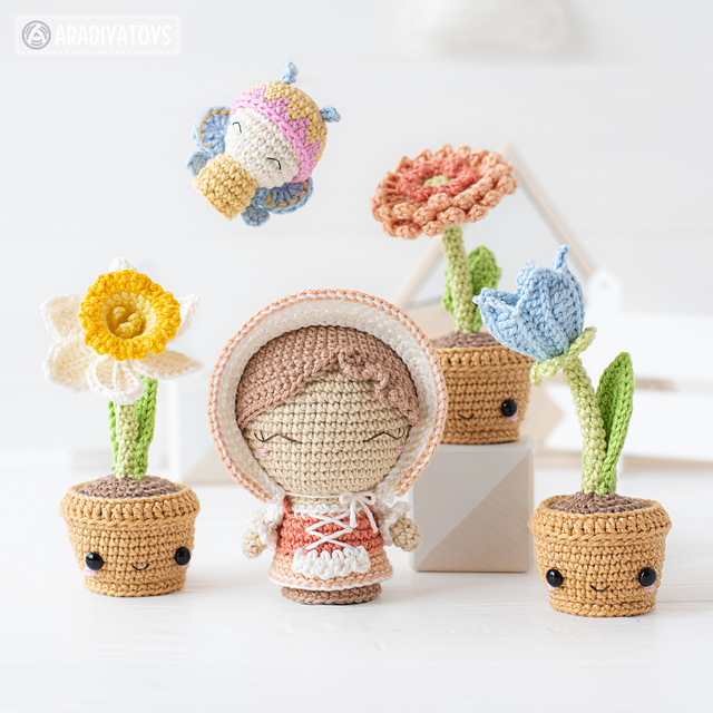 Flower Garden – the flower-themed set of toys from the ‘Mini Kingdom’ collection. This pattern describes how to create the following five toys: Flower Girl, Bellflower, Narcissus, Gerbera and Butterfly.