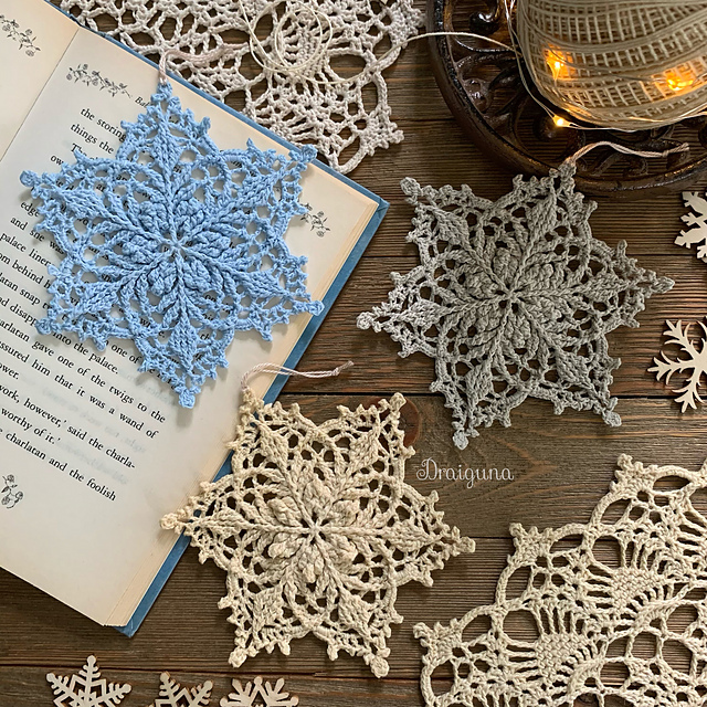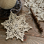 This snowflake pattern has 11 rounds and measures about 4 1/2". The pattern has written instructions and a photo tutorial. The photo tutorial includes a chart for every round and step by step instructions for some of the more difficult stitches.
